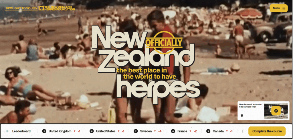 It combines audacious messaging backed up by hard data, all superimposed over placid New Zealand imagery of rolling hills and fields of sheep. It’s also interactive, inviting site visitors to test and expand their knowledge with short video courses and featuring a leaderboard of participants’ countries. By blending humor with compassion, the campaign invites us follow its lead in destigmatizing herpes, initiating a conversation that will break down taboos.